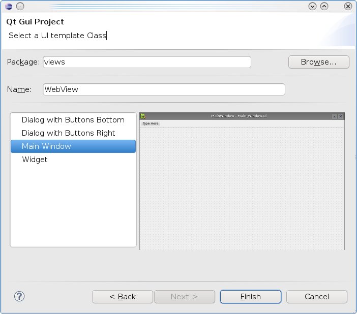 views/WebView.java, and the contents should be as follow:package views; import com.trolltech.qt.gui.*; public class WebView extends QMainWindow { private Ui_WebView ui = new Ui_WebView(); public Ui_WebView ui() { return this.ui; } public WebView(QWidget parent) { super(parent); ui.setupUi(this); setWindowTitle("A custom browser for your application"); } }Next let’s design our interface
